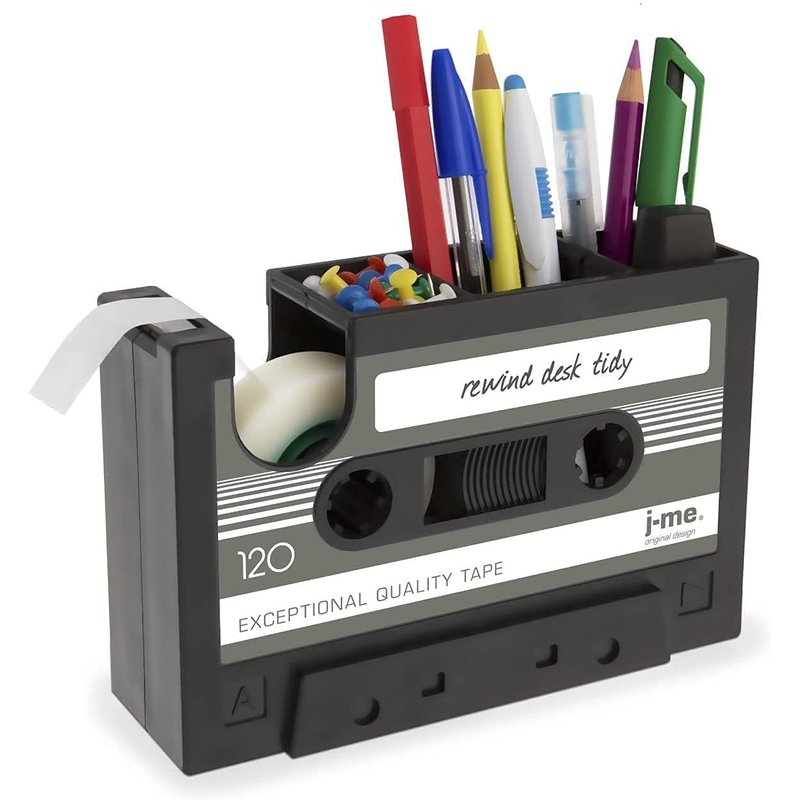 - *Features:It's shaped just like a retro cassette tape and is a great storage solution for up to 30 pens or pencils and small stationery items like paper clips, push pins, elastic bands or staples. Instead of housing audio tape, this cassette shaped desk tidy will dispense sticky tape.