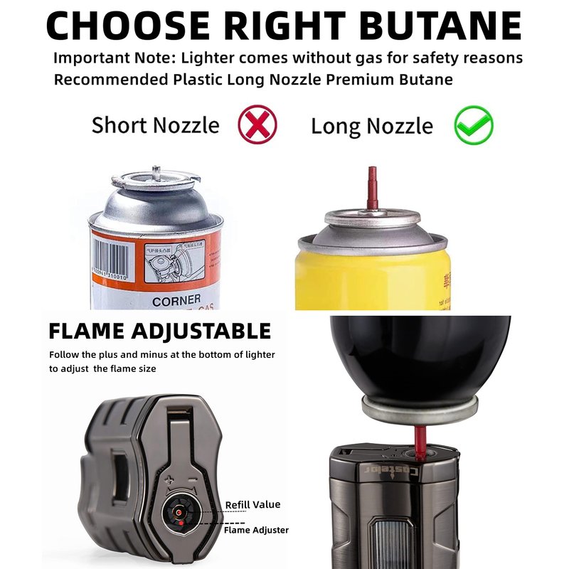 For safety reasons and shipping safety regulations, Castelar cigar lighter will be delivered without butane. Please choose premium and long nozzle butane when filling.