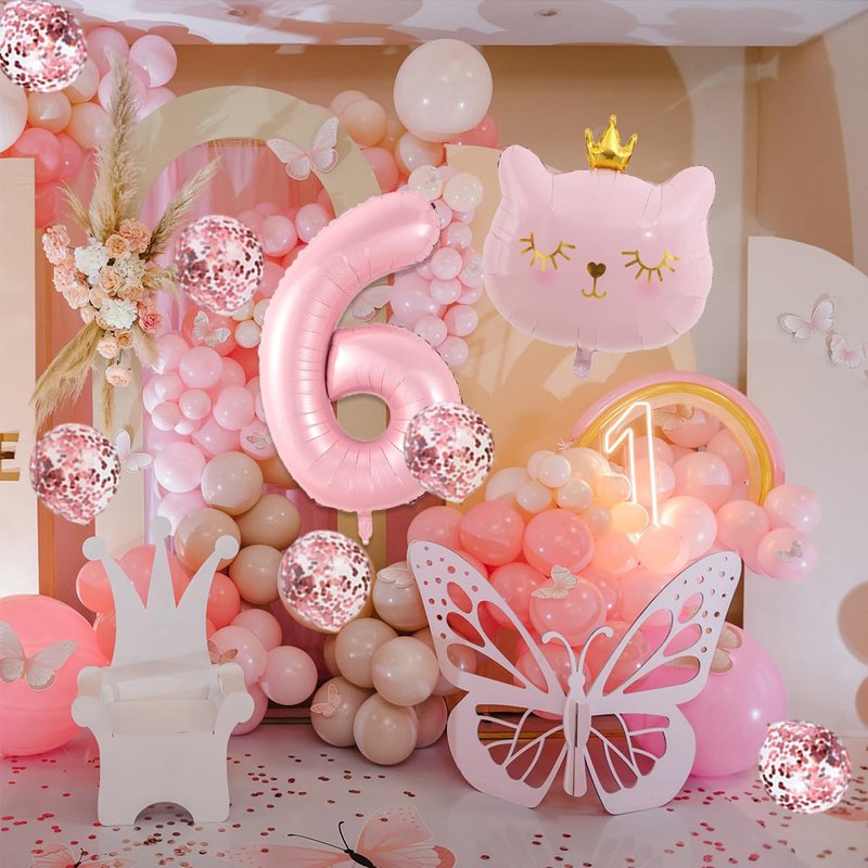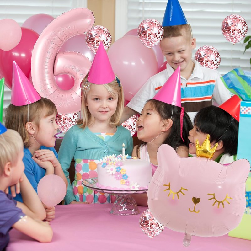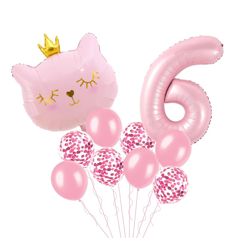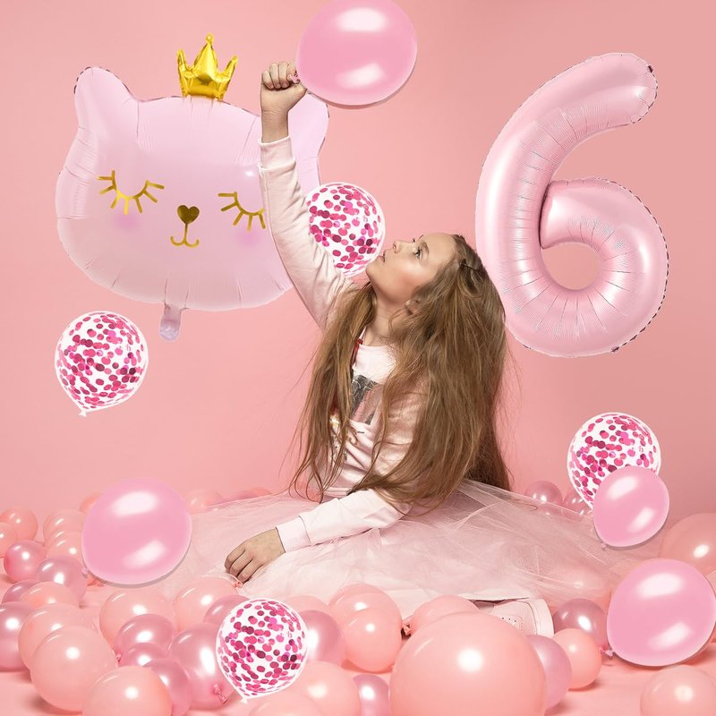 - Cat Party Decorations Set: 1PCS number 6 balloon 40 inch, 1PCS large cat balloons 27*22.5inch, 4PCS pink balloons, 4PCS pink confetti balloons 12 inch.