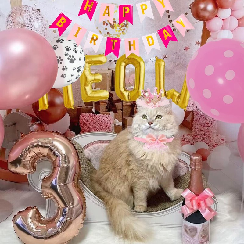 😼 This cat birthday party pack include 1xCat Birthday Hat,1xCat Birthday Cake Topper, 1xCat Tutu Skirt, 1xCat Bow Tie, 1xHappy Birthday Banner, 1xMeow Foil Balloon, 2xCat Paw Printed Balloons, 2xGold Confetti Balloons, 4xPink Dot Balloons with straw and strings to help you throw a simple and cute birthday party for you cats.