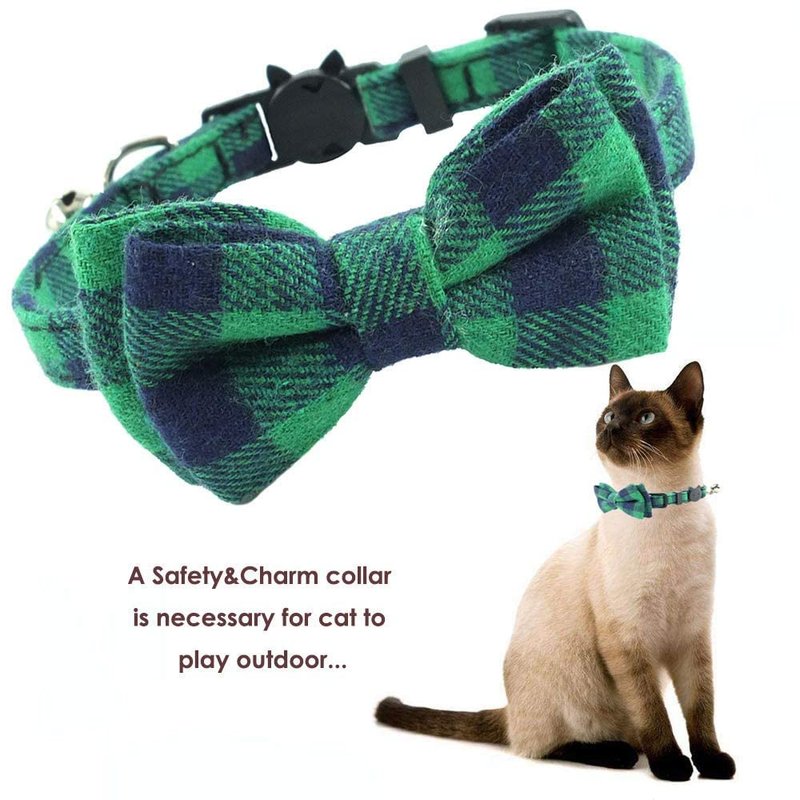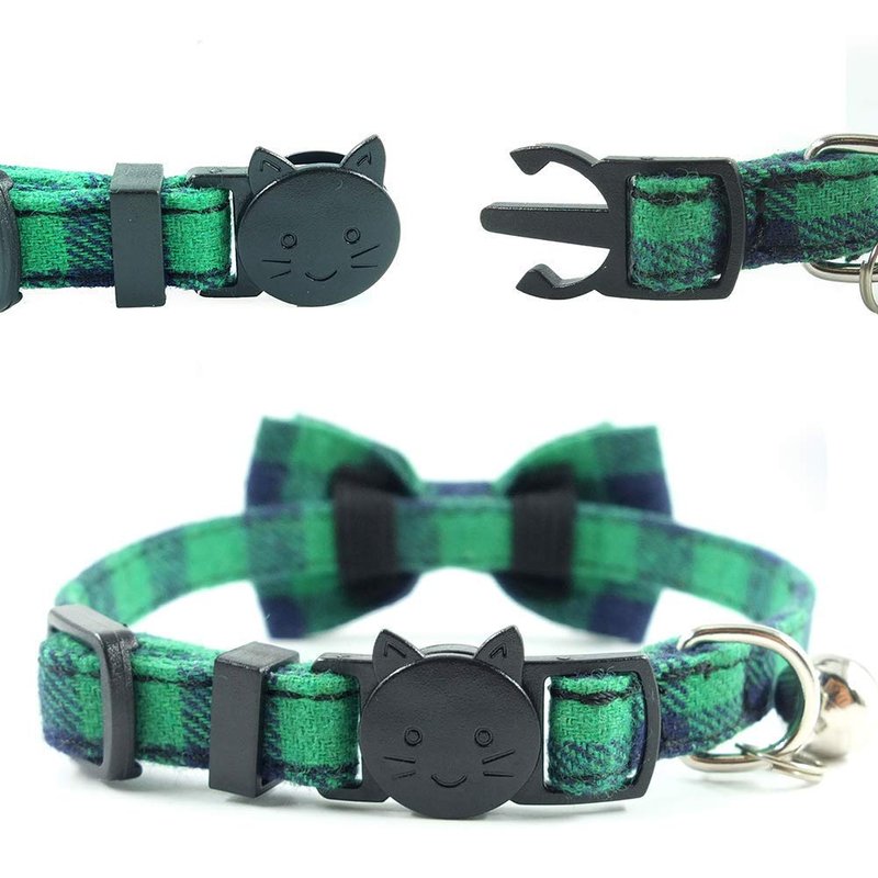 Cat Collar Breakaway with Bell and Bow Tie, Plaid Design Adjustable Safety Kitty Kitten Collars(6.8-10.8in) (Green Plaid)