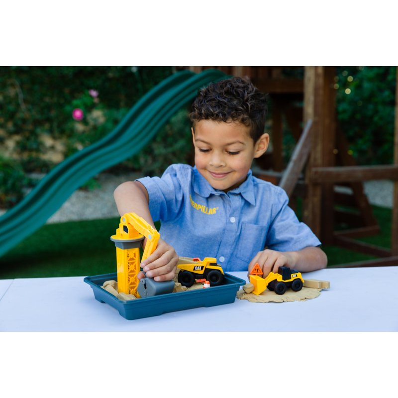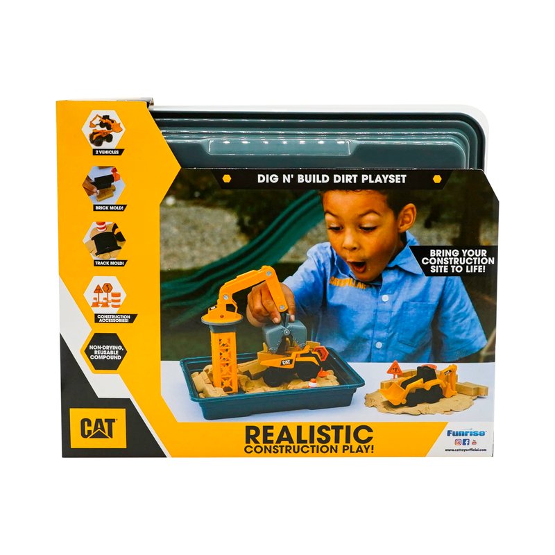 CAT Construction Toys, Dig N' Build Dirt Playset with 12 OZ of Compound - Includes 2 Little Machine Vehicles, Crane, and Storage Container.