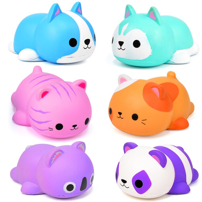 - Lovely Squishies Stress Balls: FLY2SKY Value Squishy toys includes 6 jumbo squishies. Innovative shapes and a little cream scented. Including panda squishy, husky, beagle, Koala, sweet cat, tabby cat squishy, exclusive suppliers on the Market. The cute cat designs capture the hearts of children and adults alike. Their adorable faces and playful details make each stress ball a character of its own. Put some fidget toys on your holiday toy list today