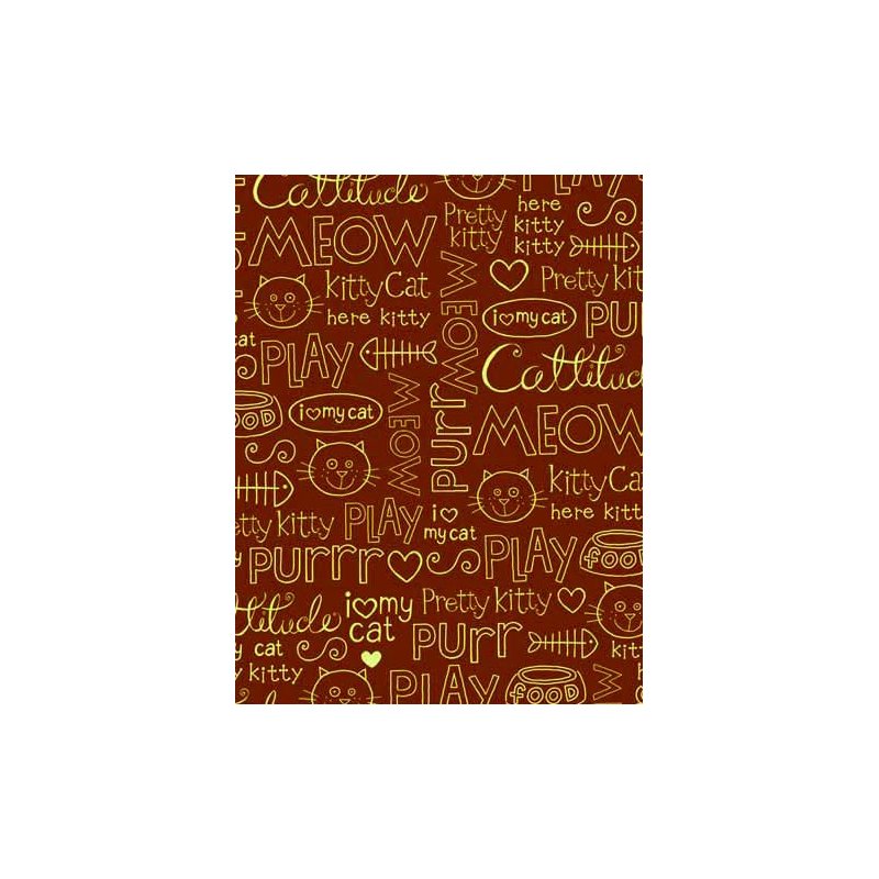 This is a brand new sealed continuous roll of Gift Wrap featuring Cat talk. The paper is 30 inches wide and 4 feet long on a brown gloss paper with lime green metallic script cat sayings.