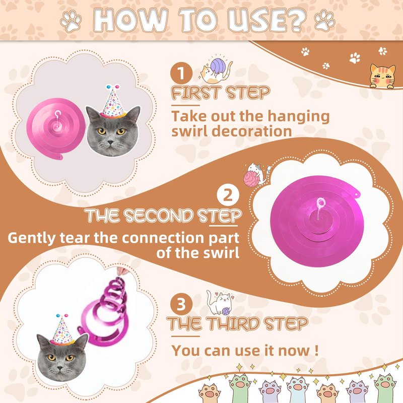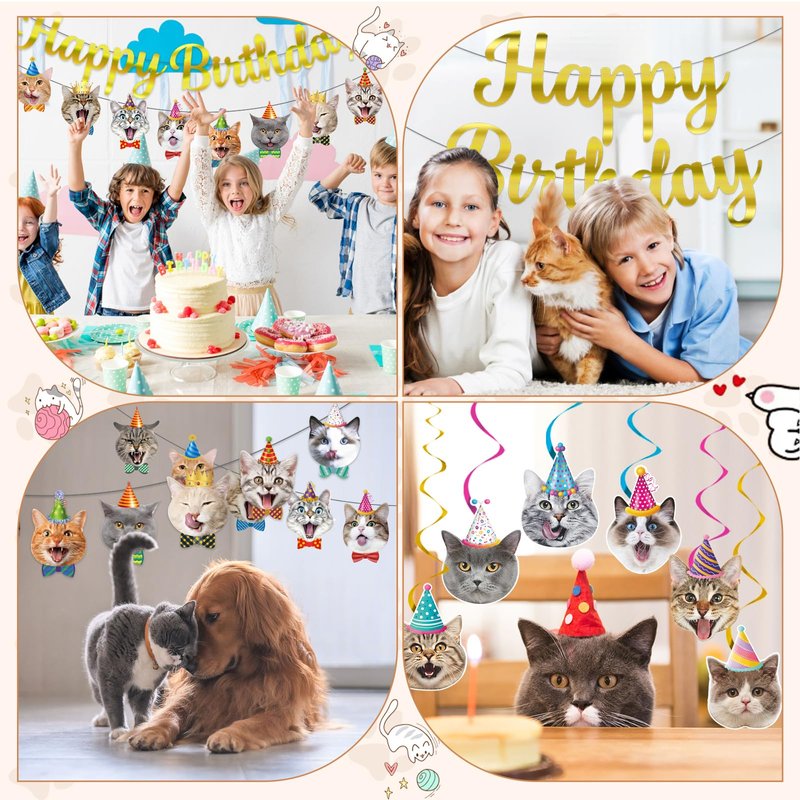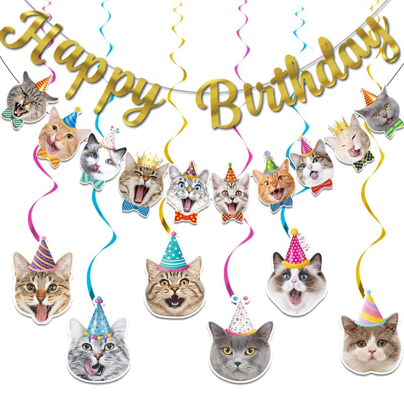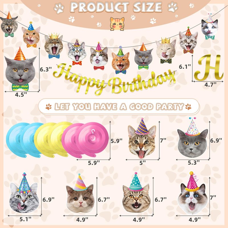 - Cat Themed Birthday Party Decorations:The cat themed birthday party decorations includes three accessories: a 5-meter long cat birthday banner, a 5-meter long Happy Birthday banner, 6 cat cards, and 6 spirals in three different colors.