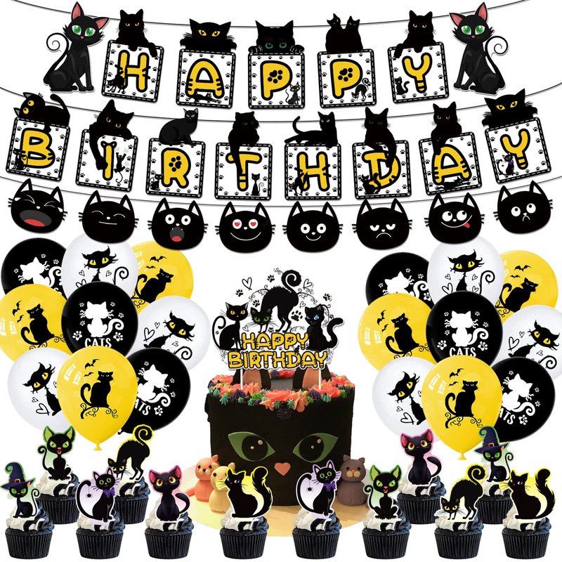 - Great Value Party Decorations: 1 pcs 5 x 3ft black cat backdrop, 1 set happy birthday banner, 1 pcs cartoon cat printed banner, 1 pcs black cat cake topper, 12 pcs black cat cupcake toppers, 18 pcs black cat balloons, 1 ribbon.