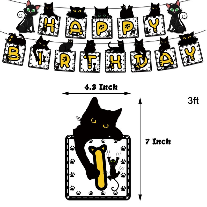 - Perfect Size: Cat background cloth is 5*3 ft (150*100cm), happy birthday banner is 4.3*7 inches (11*17.8cm), cat printed banner is 6.29inches (16cm), happy birthday cake topper is 6.3*4.7inches (16*12cm), cake toppers are 3.4inches (8.6cm), black cat balloons are 12 inches(30.5cm).