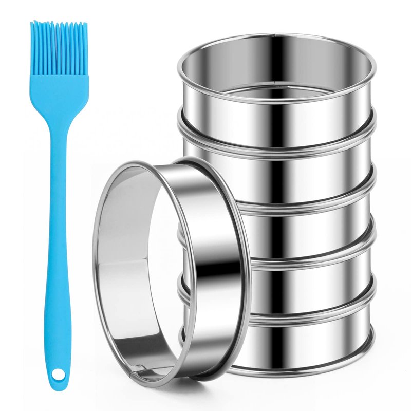 Catcan 6 Pieces English Muffin Rings, 3.15 Inch Stainless Steel Crumpet Ring Double Rolled Tart Ring Nonstick Metal Round Ring Molds with Silicone Oil Brush