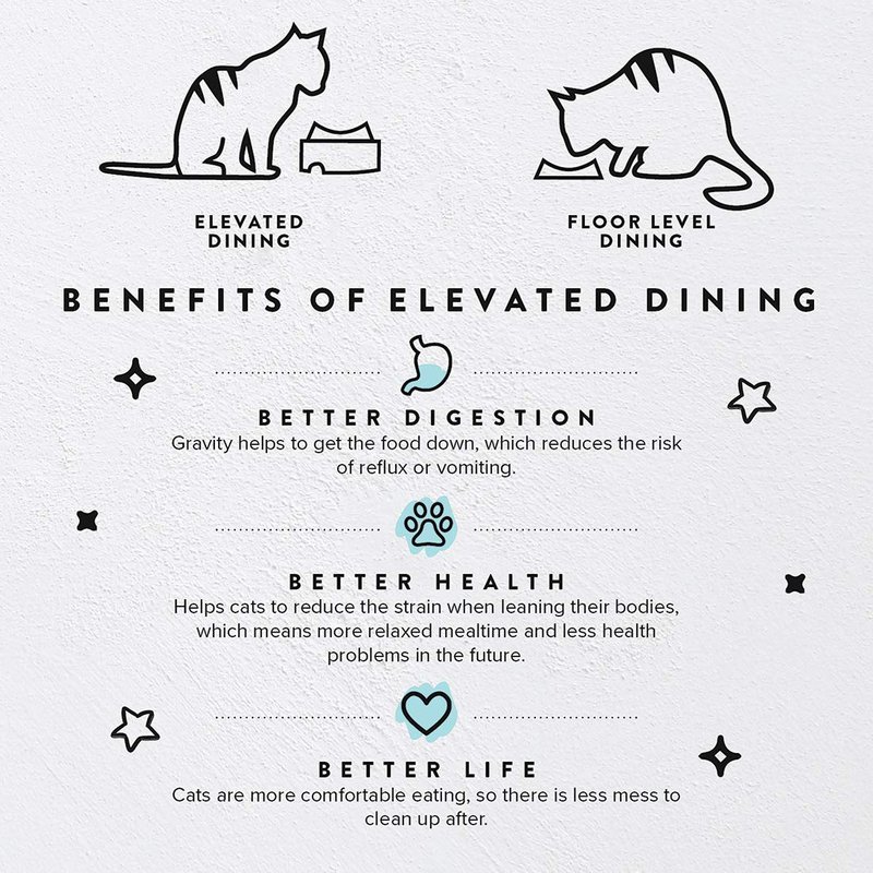 - ⭐️ BETTER DIGESTION: Cat’s stomach gets compressed when they eat in a crouched position. That means their stomach gets full faster and it can cause ingestion. Because this position is so uncomfortable, cats also eat more rapidly swallowing air while eating. CatGuru Food Table elevates the bowls to a comfortable level. Cats are enjoying their meal without rushing and gravity helps to get the food down, which reduces the risk of reflux or vomiting.