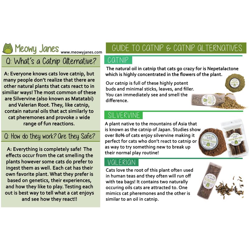 - Our Catnip Alternative Variety Box lets your cat try what they have been missing! There is something here for every kitty to enjoy... you may even find that they have a new favorite!