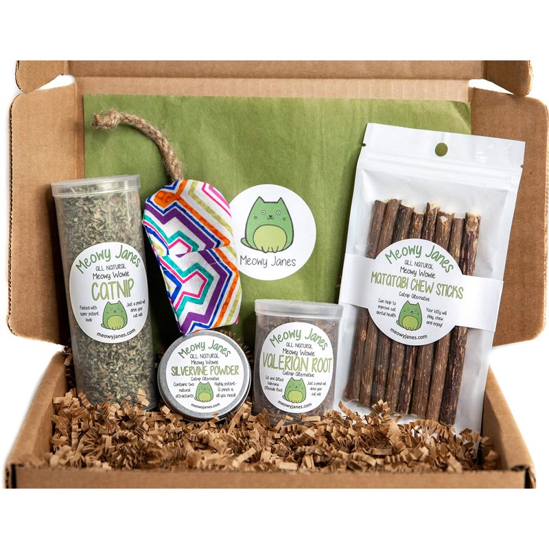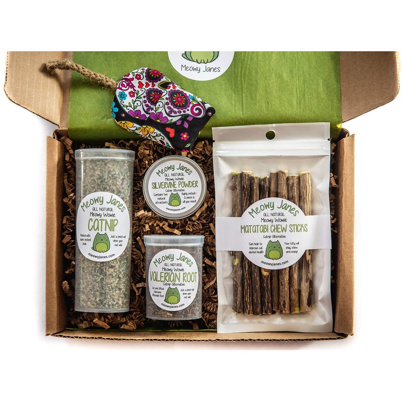 - Box contains: Catnip, Valerian Root, Silvervine Powder, Matatabi Chew Sticks, and a handmade Refillable Mouse Toy