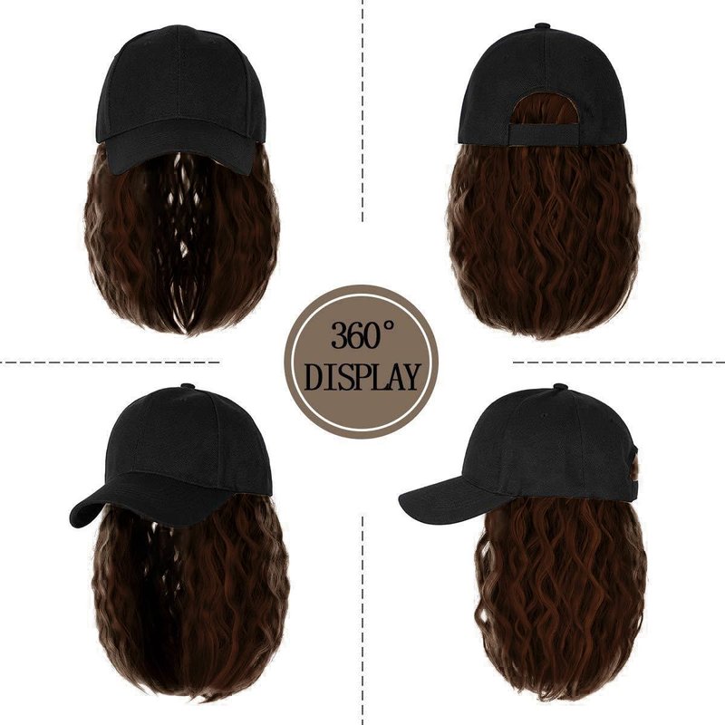 CATTREES Black Baseball Cap with Hair Extensions Adjustable Hat 14 ''Short Wavy Curly Synthetic Hair Wigs for Women Girls. (US, Alpha, One Size, DARK BROWN)