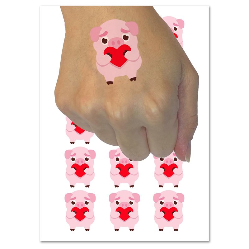 Cautious Pig with Heart in Hands Temporary Tattoo Water Resistant Fake Body Art Set Collection - 54 1" Tattoos (1 Sheet)