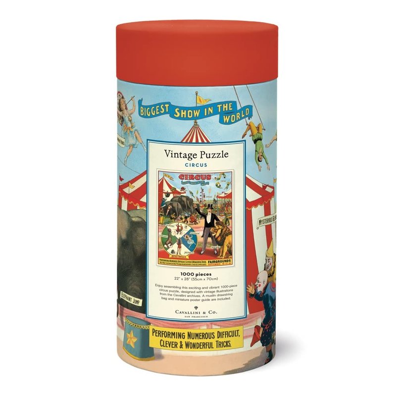This Cavallini 1000 piece puzzle features vintage circus posters. The puzzle is contained in a 10 inch tube, along with a muslin hand sewn bag. The finished puzzle measures 20 x 28 inches.