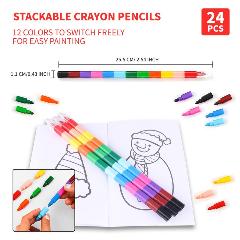 - [Package Includes]: the Christmas coloring books set includes 24 pieces of Christmas coloring books in 12 styles and 24 pieces of stacking crayons in 12 colors; Each book has 6 pages, 72 various patterns in total, Various cute Christmas patterns will add more fun to leisure, letting your kids learn color recognition, inspiring imaginations, and more