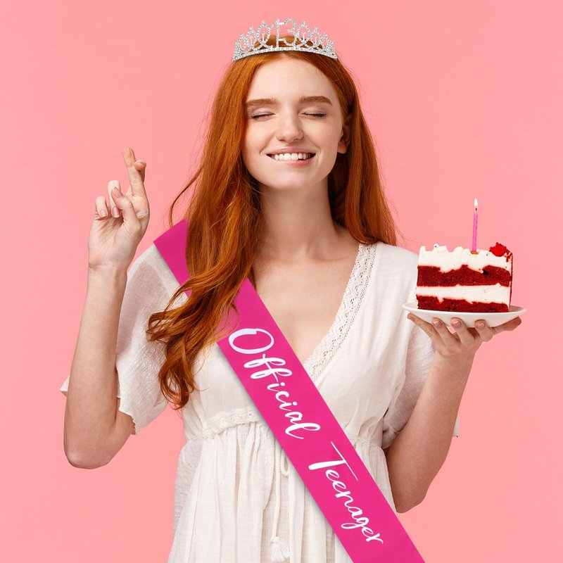 - Hot Pink “Official Teenager” Sash + Rhinestone Tiara Gifts Set.