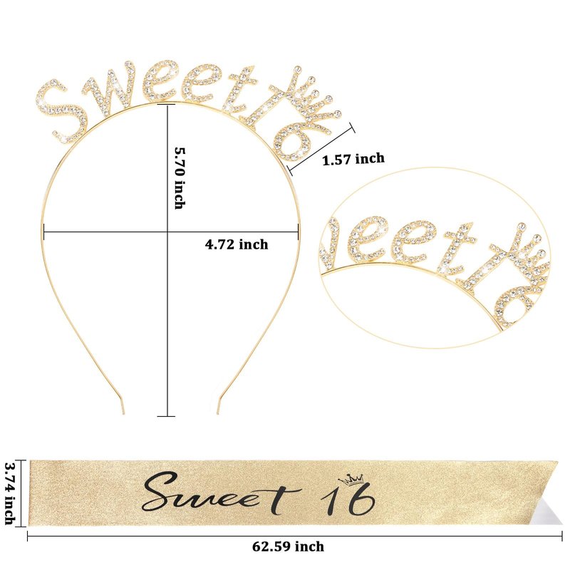 - One Size Fits All-The birthday sash is 62.59 inches long, and our sash fits all types of bodies. The Happy Birthday set comes with pins to adjust the size of the sweet 16 sash. The width of the birthday headband can be stretched according to your head.