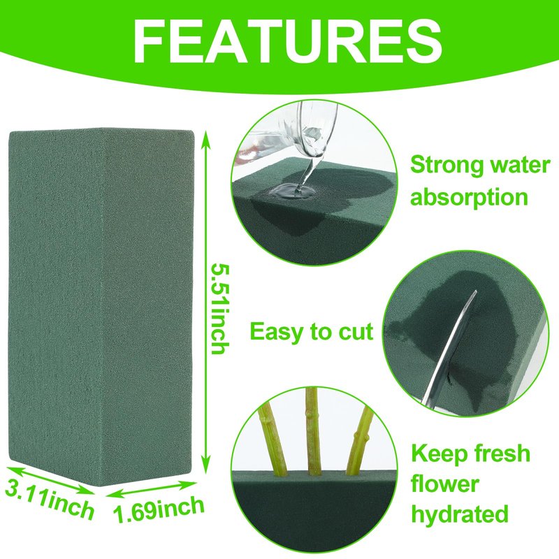 - Easy to Use:The green floral foam bricks can be cut into any shape as you want,put it into water slightly and wait for one minute until it absorbed water fully.