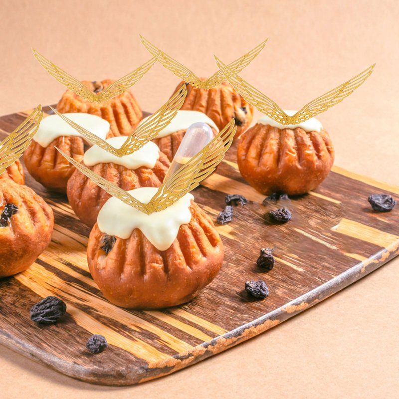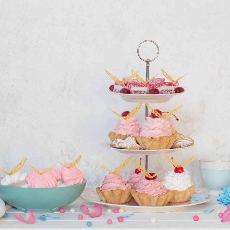 CCINEE 50 Pcs Gold Glitter Wings Wizard Chocolate Decoration Cupcake Toppers Hollowed Golden Wings Wafer with Glue Point Dots for Themed Party Birthday Cake Wedding