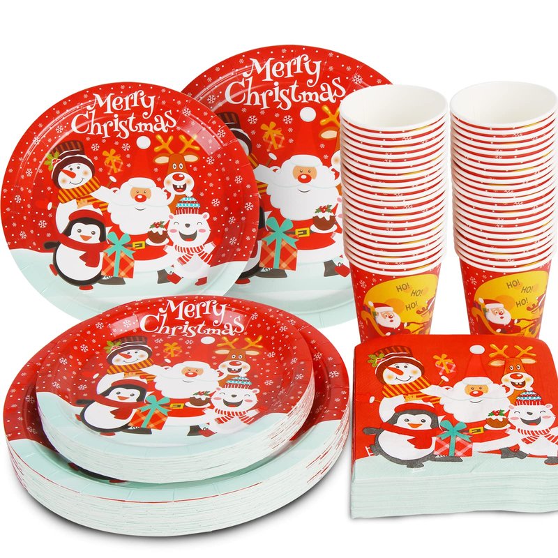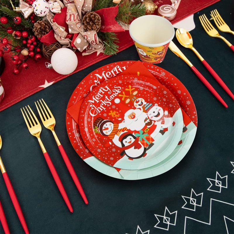 - Premium Quality: Our Xmas party supplies kit made of premium food-grade paper. Strong and sturdy. The plates have great construction that can handle lots of food. The flatware set is safe and durable. The cups with rolled rim that is for rigidity and strength to prevent unwanted spills and deforming. Suit for hot and cold drinks. And 2-ply napkins with great extremely absorbent. Good for immerse you in the party food time!