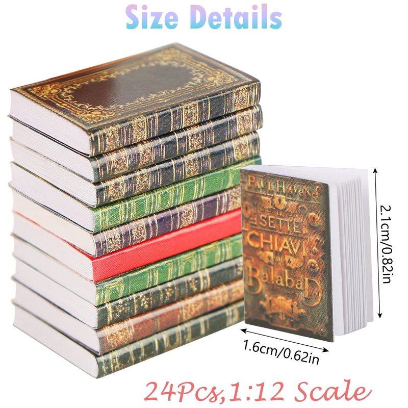 - Package Includes: 24 pcs mini 1:12 scale miniature dollhouse books in different styles. Enough tiny books to decorate a mini beautiful dollhouse.