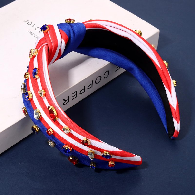 - ♥Rhinestone Knotted Headband -- Get ready for the Fourth of July with this jeweled top knot headband. Pair them with your favorite tees, tank tops, shorts, cut-offs, jeans and sundresses for a cute and festive patriotic outfits. Your patriotism is on full display with this red, white and blue American flag hairband. These will look great as we celebrate our great Memorial Day, Flag Day, or Fourth of July!
