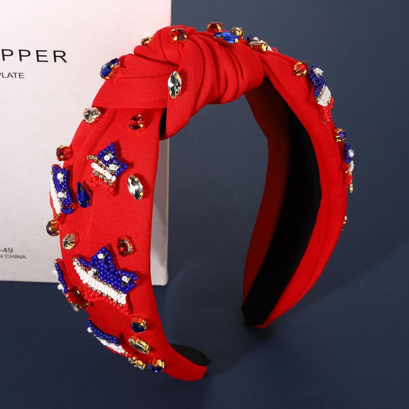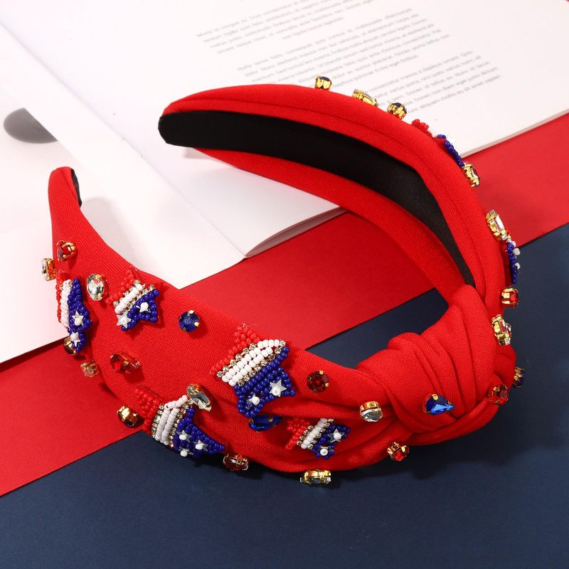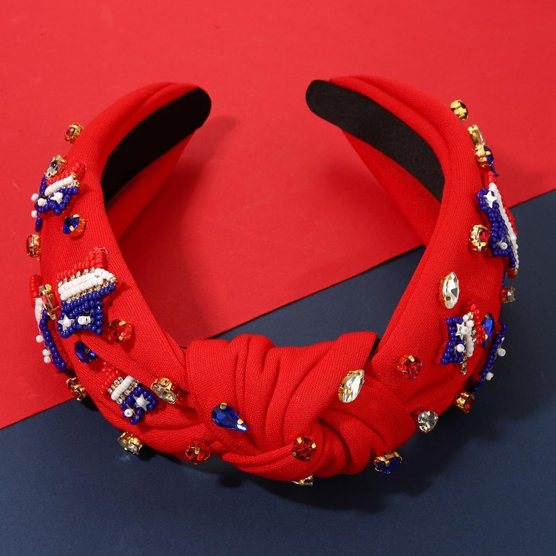 - ♥Rhinestone Knotted Headband -- Get ready for the Fourth of July with this jeweled top knot headband. Pair them with your favorite tees, tank tops, shorts, cut-offs, jeans and sundresses for a cute and festive patriotic outfits. Your patriotism is on full display with this red, white and blue American flag hairband. These will look great as we celebrate our great Memorial Day, Flag Day, or Fourth of July!