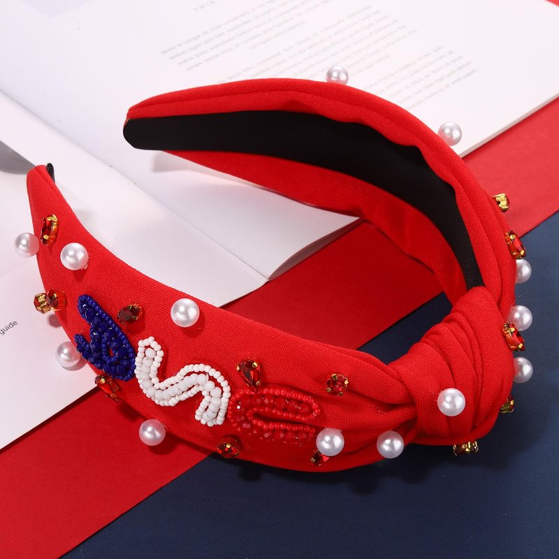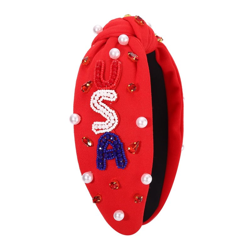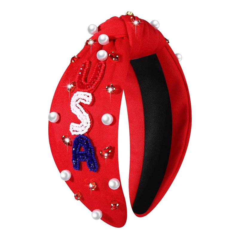 - ♥4th of July Headbands -- Celebrate the 4th of July and show off your patriotic pride with our embellished knotted headbands. Features beaded letter ‘USA’ in red, blue and white down the both sides and embellished with shinny rhinestone pearls, adding a little bit of sparkle elements and festive cheer to your 4th of July outfits. The perfect 4th of July accessories to show your patriotism and pride in our great nation