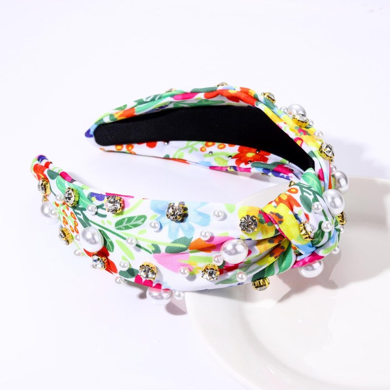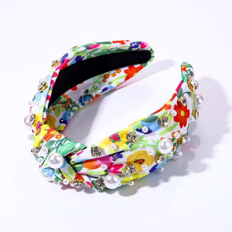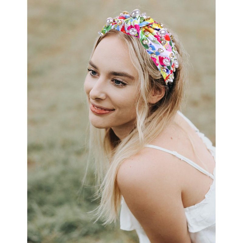 - ♥ Pearl Knotted Headband -- Keep blooming with our beautiful Flower Headband. Features a delicate floral printed top knot headband with right amount of showstopping pearl and crystal embellishments that makes this knotted headband a subtle, but yet sophisticated statement. The pearl headband adds an elegant touch to your summer wardrobe and is the perfect way to top off any look, perfect for the summer holiday, a garden party or just a relaxing day on the beach