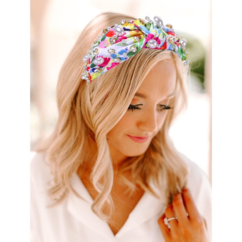 Features a delicate floral printed top knot headband with right amount of showstopping pearl and crystal embellishments that makes this knotted headband a subtle, but yet sophisticated statement.