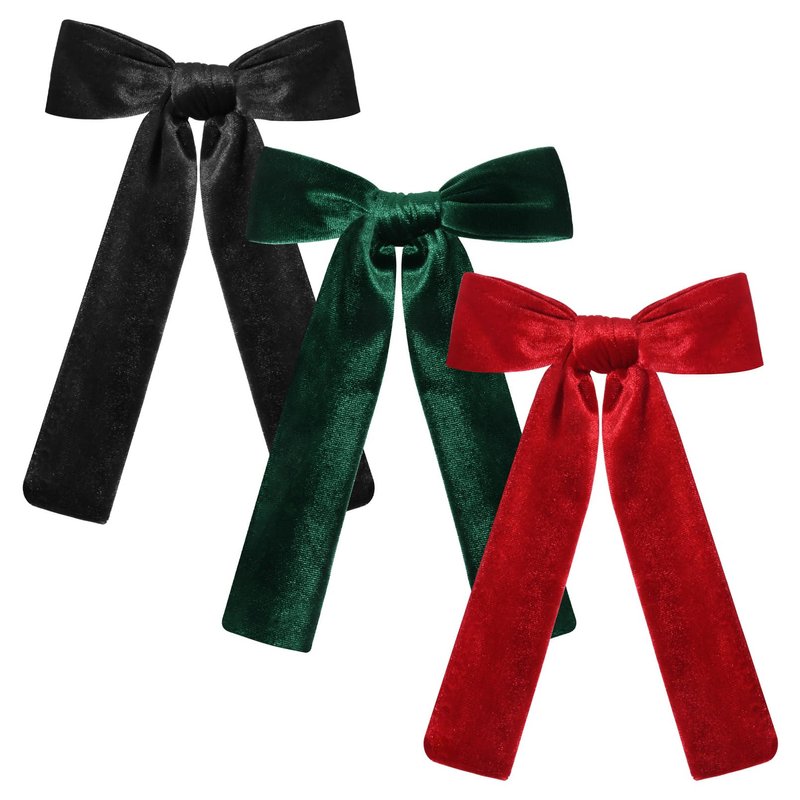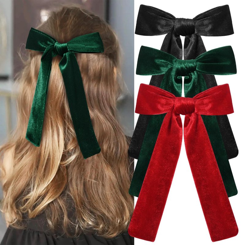CEELGON 3 PCS Long Tail Velvet Hair Bows Hair Bow Set for Toddler Girls Long Ponytail Knot Bows Alligator Clip Hair Accessories for Girls and Women (Red, Green, Black)