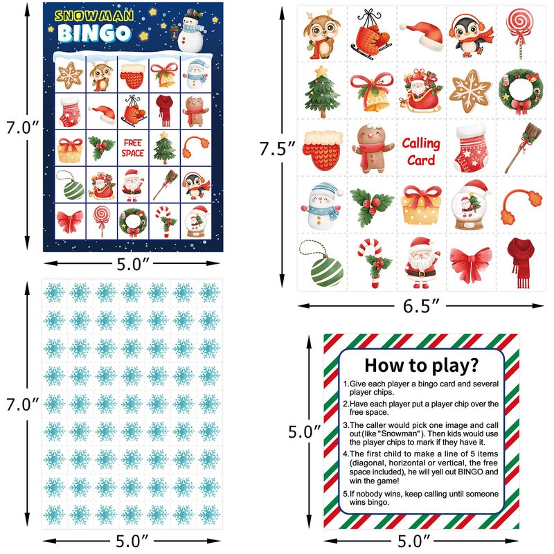 - What You Get - Snowman bingo game includes 24 game cards, 24 calling cards, 441 bingo makers and game instructions.