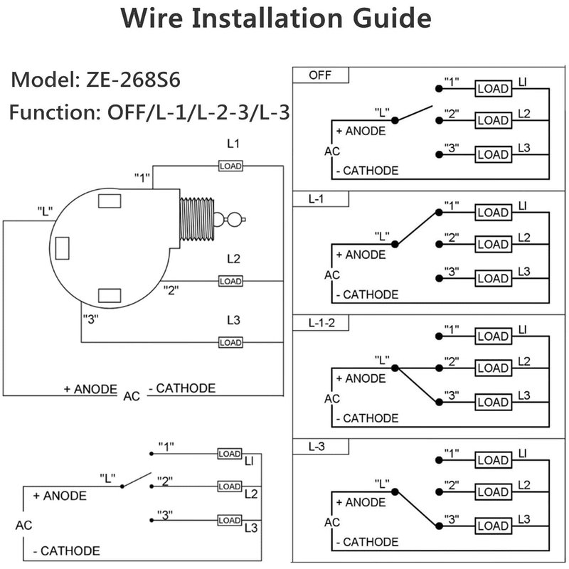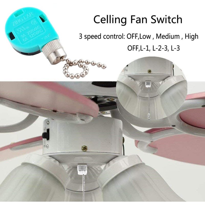 This ZE-268S6 ceiling fan is designed with 4 wires rotary control and 3 speed models.Three speed control: OFF,L-1, L-2-3, L-3 (OFF,High, Medium ,Low ). Switch Type: Pull chain switchElectrical rating: 6A/125VAC-3A/250VAC. Material:metal antique brass chain, Plastic Up Shell Plastic Base.