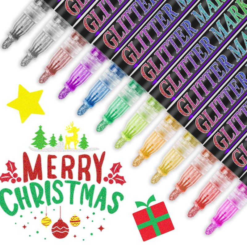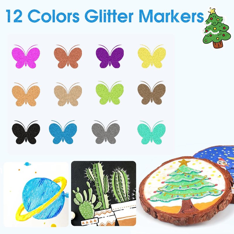 - 🎨12 Colors Sparkly Glitter Markers: Classic 12 glitter paint Markers pens, each infused with glittering pigments that add a mesmerizing sparkle to every painting. Beautiful fluorescent gloss combined with waterproof, quick-drying, high-coverage advantages, can bring you better art experience fun.