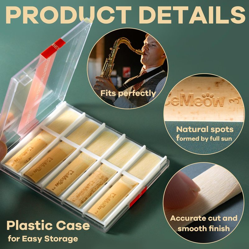 - High Quality Natrual Reeds: CeMeow reeds for saxophone are all made of grown-up natrual reeds, Ten reeds are placed above and below the gasket respectively, separated by baffles, greatly reducing the possibility of damage