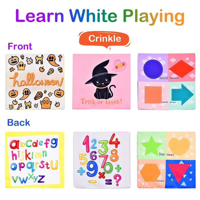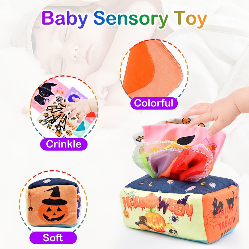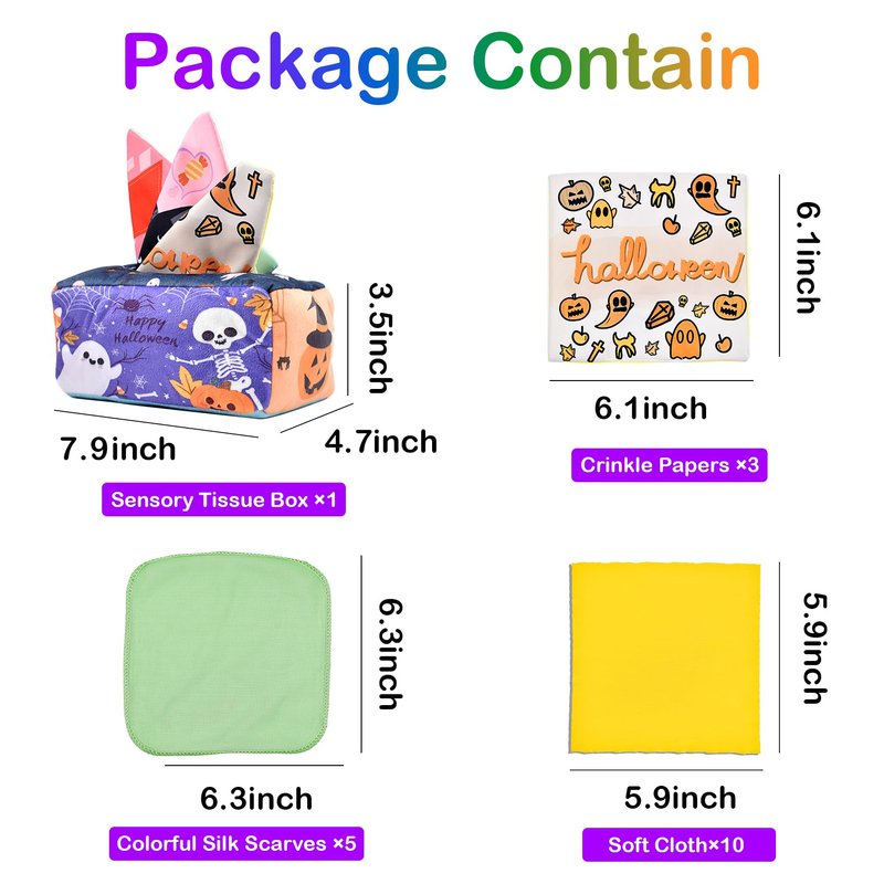 - Fun Montessori Toy for Babies - Soft montessori tissue box toy includes 1 tissue box designed for Halloween, 3 crinkle tissues with Halloween patterns, 5 colorful silk scarves, and 10 pieces of soft cloth in three colors. It is an ideal choice for babies over 6 months old.