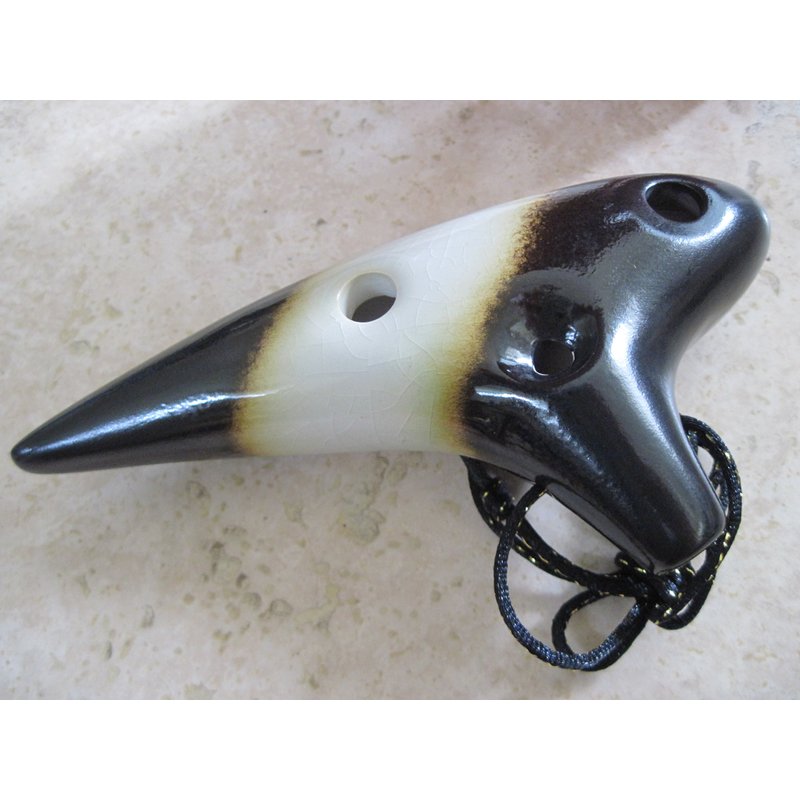 Ceramic Ocarina Soprano G w. Crekles. Black and White interlaced (Panda) Pleasant crystal, chirpy sounding. Size: 5 3/4 inch (Width) 3 inch (Height) 1 1/4 inch (Thick) Weight: 120 g (4.2 Oz).