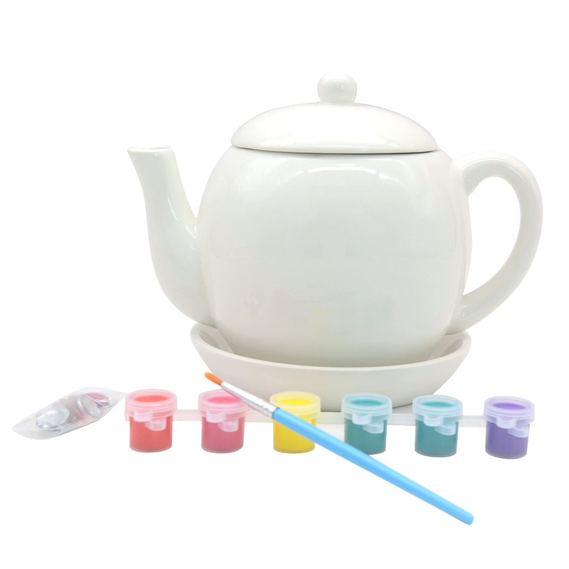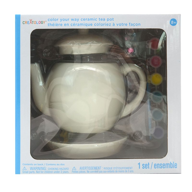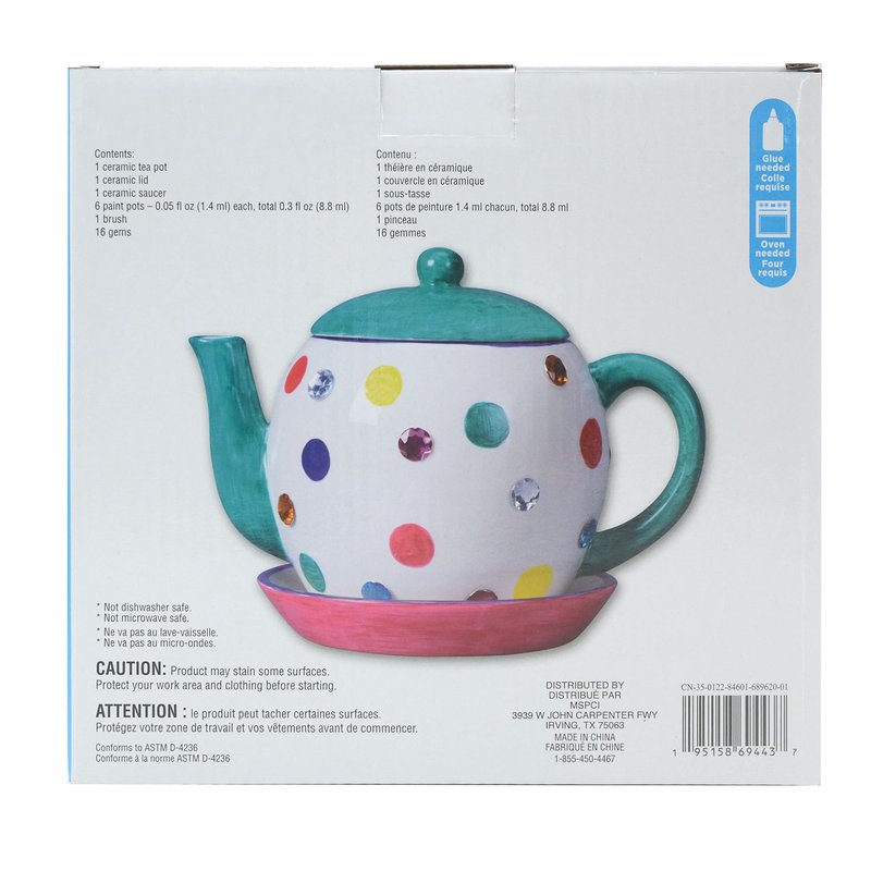 - Includes assorted paint colors. Makes 1 teapot. Glue and oven is needed (not included). Conforms to ASTM D-4236. Ceramic. For ages 8 and up. 16 gems. 6 paint pots. 1 ceramic tea pot. 1 ceramic lid. 1 ceramic saucer. 1 brush.