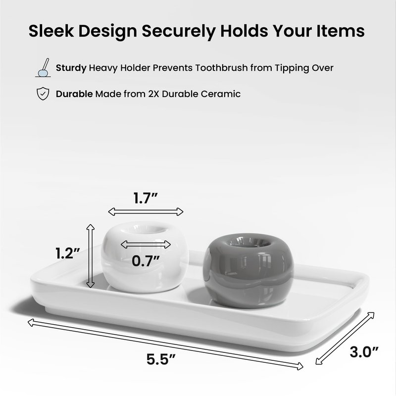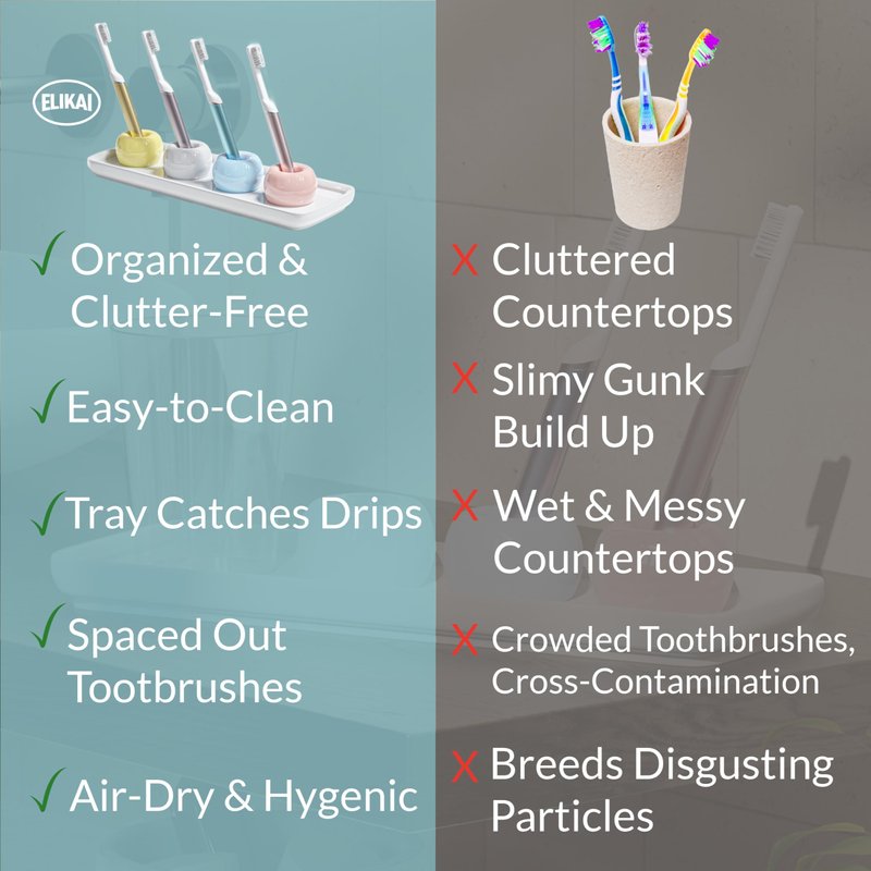 If you are looking for a way to keep your toothbrushes clean while keeping your countertop water-free, the ELIKAI Toothbrush Holders and Tray Set is your answer. The minimal but modern looking toothbrush holders and tray set helps air-dry your toothbrushes (no more nasties on the bottom of your cups!) while the white tray prevents water on your countertops from a dripping toothbrush. Very easy to clean, the ELIKAI Ceramic Toothbrush and Tray Set will help declutter your countertop from any cups, containers, or bulky organizers. Other great features include: (1) different color holders to help differentiate your toothbrushes (2) Holes at the bottom of the holder to let water seep through but caught by the tray keeping it clean (no more build up!) (3) The holders are separate from the tray for easy cleaning white ceramic tray helps protect and keep surfaces clean. (4) Doubles as a razor, stationary, or make-up organizer. Use it for pens, pencils, mascara, your Ipad pen, etc. As with with all ELIKAI products, it comes with a hassle-free 100% money back guarantee and our assurance to you that if we don't use it ourselves everyday at home or at the office, we won't sell it.