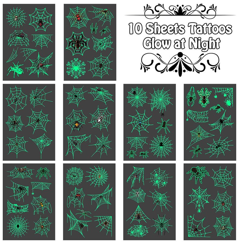 Cerlaza 10 Sheets Glow Spider Web Temporary Tattoos for Halloween Decorations, Fake Small Spider Tattoos for Halloween Party Games Favors Supplies, Halloween Treats for Adults Kids