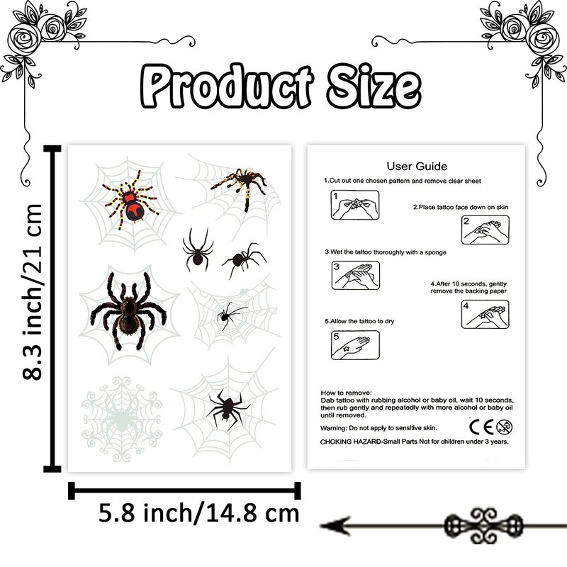 - 【Package include】10 temporary spider tattoos for Halloween party decoration and supplies, size: 4.3*3.0 inches (110*75cm). There is also an instruction for use, if you are using temporary tattoo stickers for the first time, it can help you complete your first experience.
