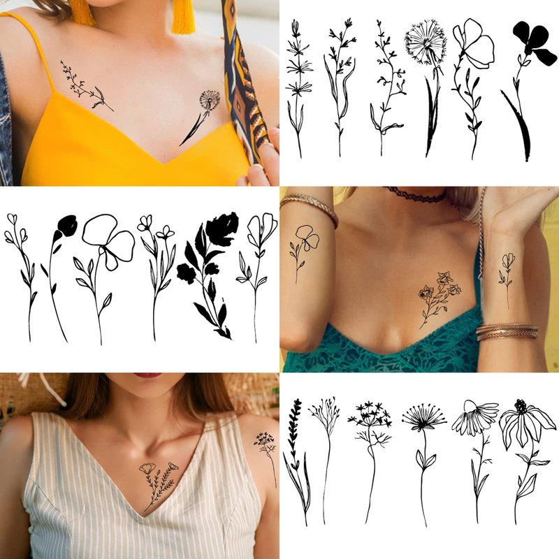 Cerlaza 75 Styles Tiny Black Flower Branch Temporary Tattoos For Women, 16 Sheets Realistic Wild Flower Floral Small Fake Tattoo, Wild Plant Tattoo Stickers for Adults Women Hands Legs Body Sticker