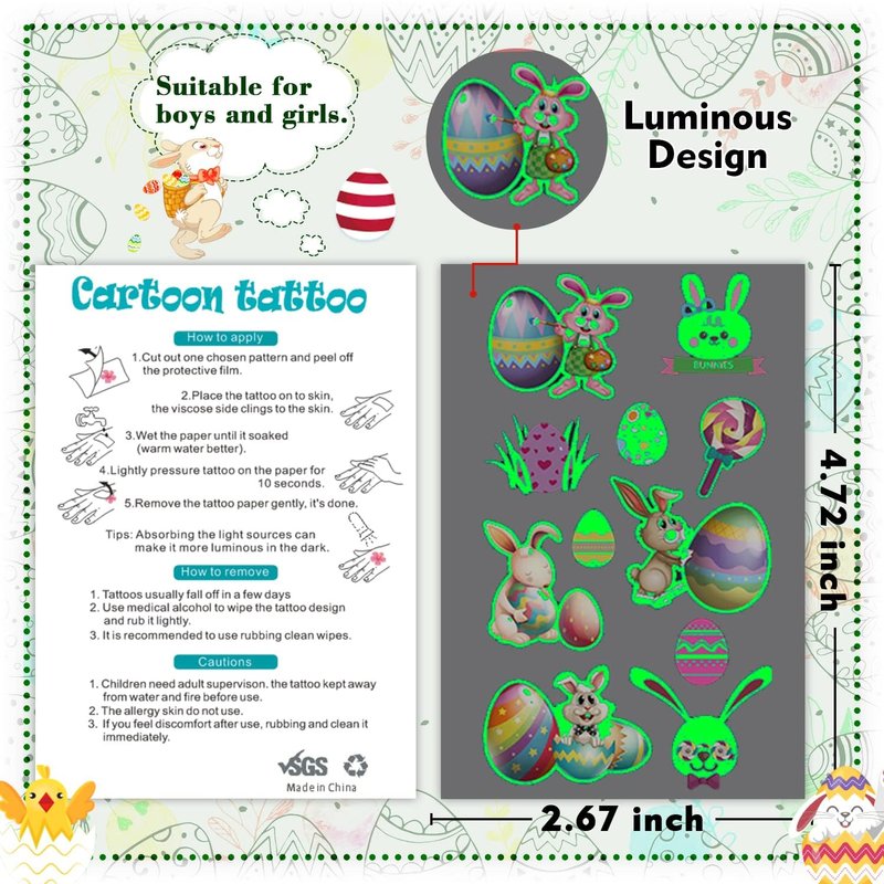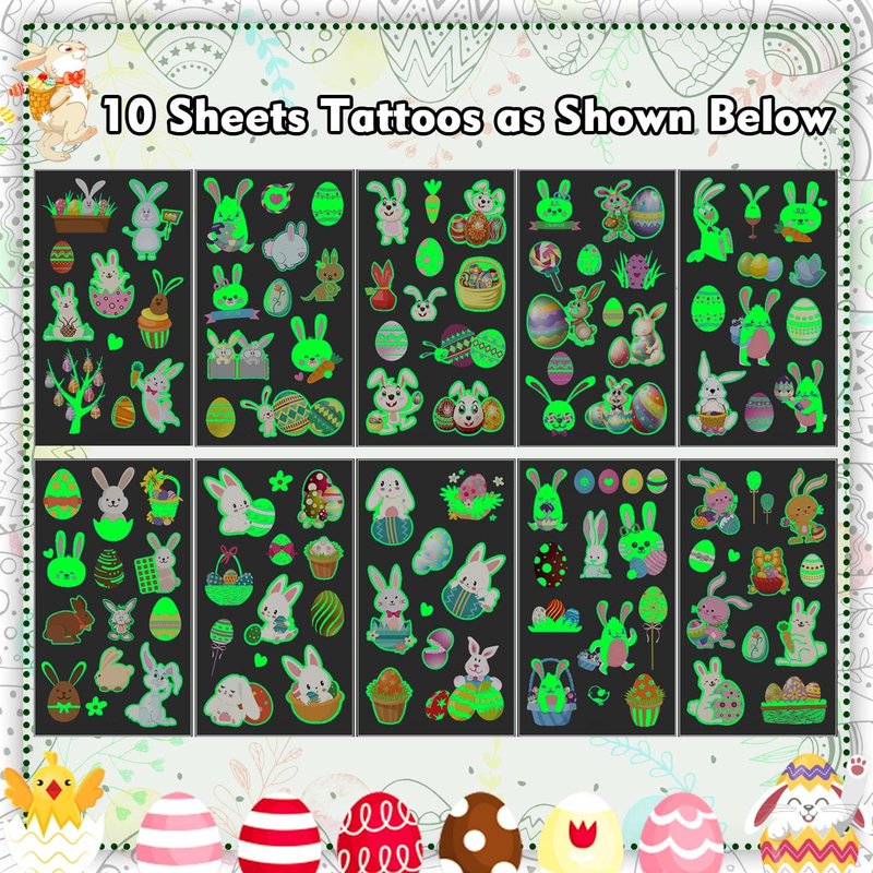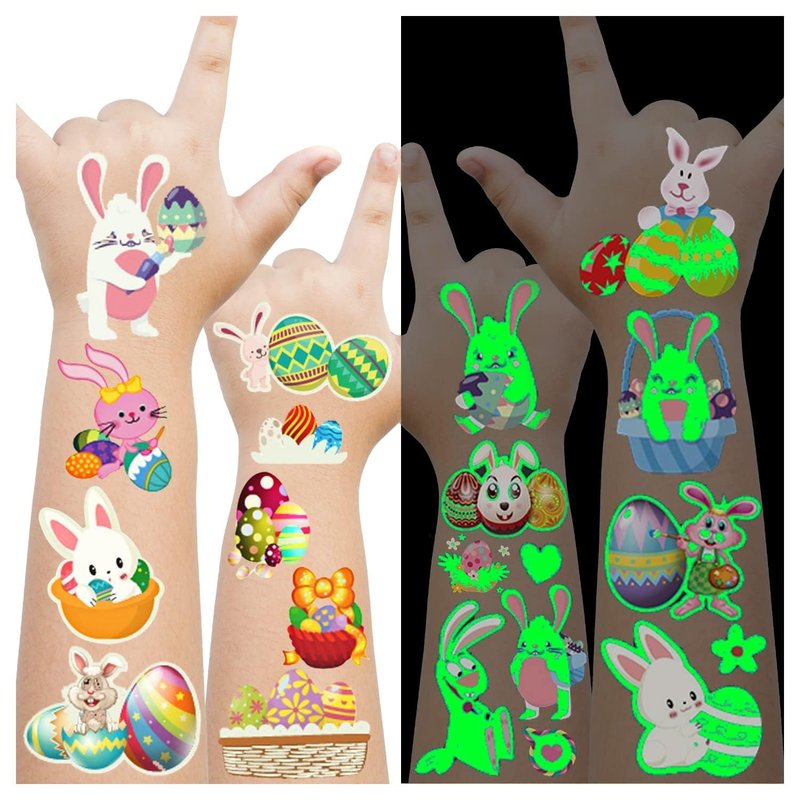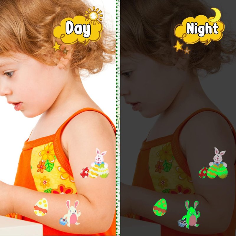 - 【Glow Easter Party Favors】Glowing Luminous Easter-themed temporary tattoos for kids feature a glow design that displays a fluorescent-colored dazzling glow at night. It is recommended that you shine these tattoos under a lamp or sunlight for a few minutes before use, the glowing effect will be better.