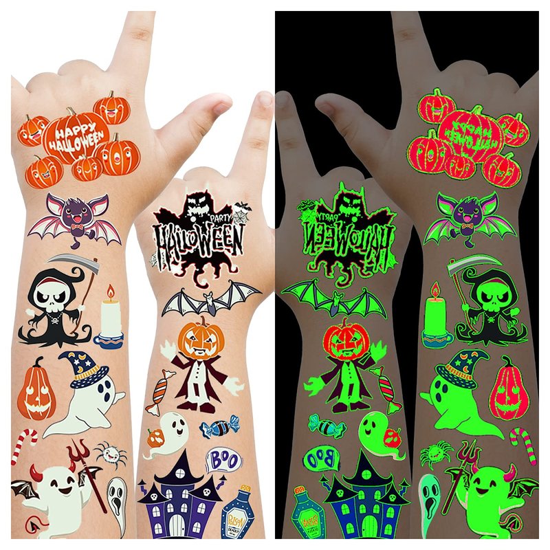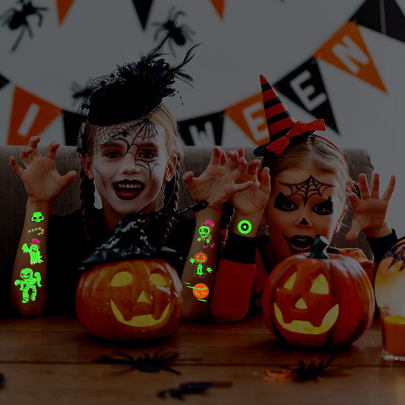 - Glow Halloween Party Supplies for Kids: Are you looking for the novel Halloween party accessories? Our glow tattoo is the choice for kids Halloween party! Unique designs include Pumpkin, Ghost, Witch, Skull, Bat, Mummy, Vampire and more.
