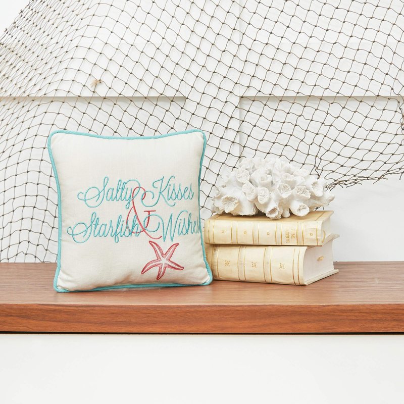- UNIQUE DESIGN: You don’t have to live by the sea to enjoy the coast. Indulge in the pleasures of the beach with the Salty Kisses and Starfish Wishes embroidered mini decorative accent pillow. Featuring seafoam, cream, blue and coral embroidery on a pearly white background, this understated accent will supplement any home style or complete your coastal paradise. This fun, beachy pillow also makes a wonderful gift.
