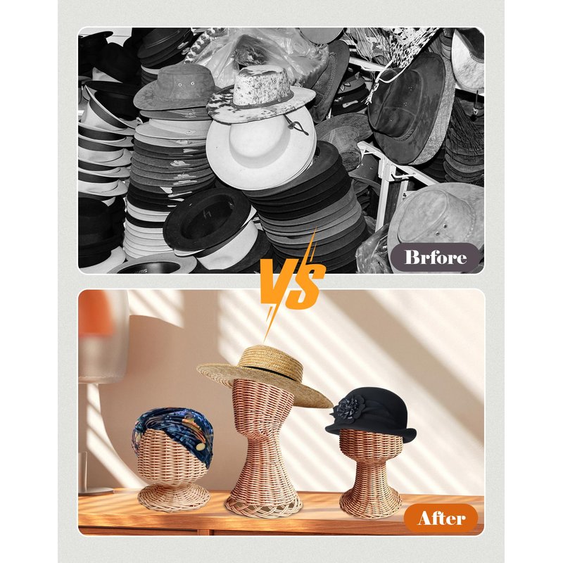 - Widely Used Occasions:Display wire wigs, fedoras, baseball caps, or wide-brimmed caps with confidence, knowing that the dome-shaped rattan top will help maintain their shape and ensure their longevity. This Rattan Stand Hat Display Holder is perfect for retail shops, salons, or even your home, this handmade wicker display stand adds a touch of elegance to any space