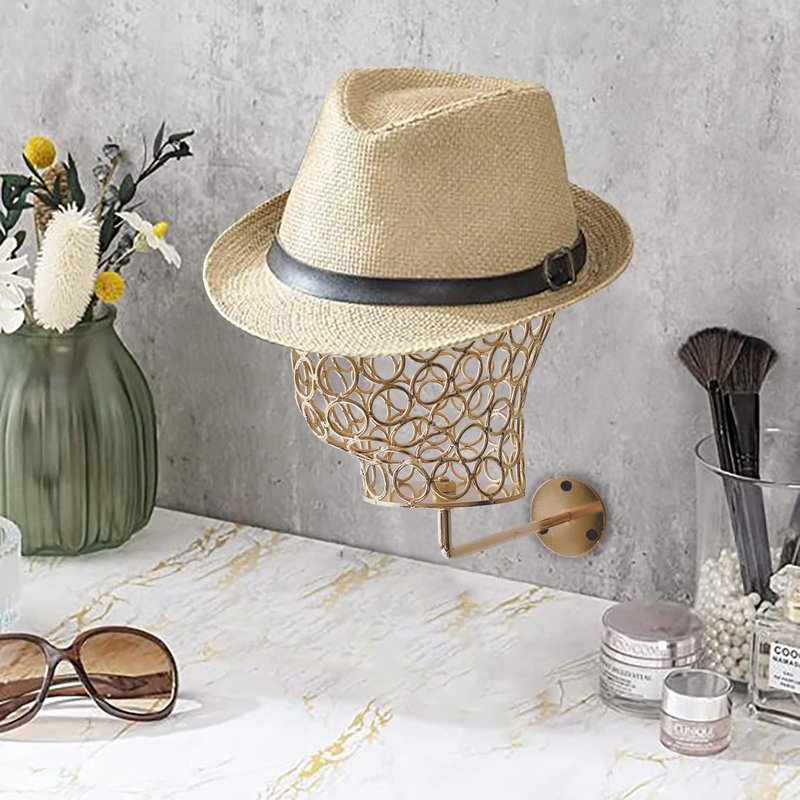 Wall Mount Hat Stand Metal Hollow Mannequin Head Stand Hanging Wig Holder 21Inch Wig Drying Holder Wig Storage Organizer Rack Hat Display Stand for Hats, Wigs, Caps, Earrings, Shine Gold