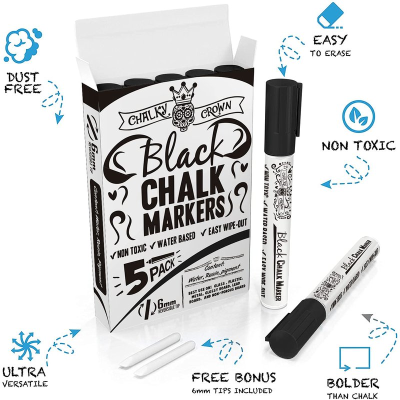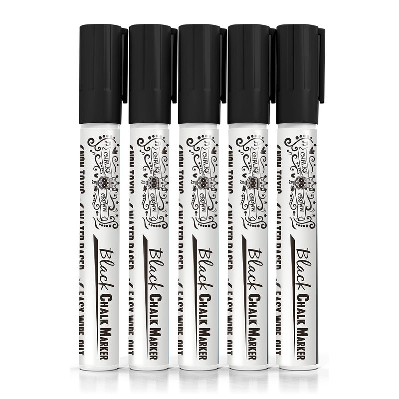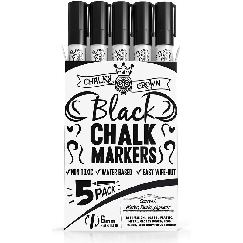 CHALKY CROWN Liquid Chalk Marker Pen - Dry Erase Marker - Chalk Markers for Chalkboard Signs, Windows, Blackboard, Glass - 6mm Reversible Tip - 24 Chalkboard Labels Included (Black, 5 Pack)