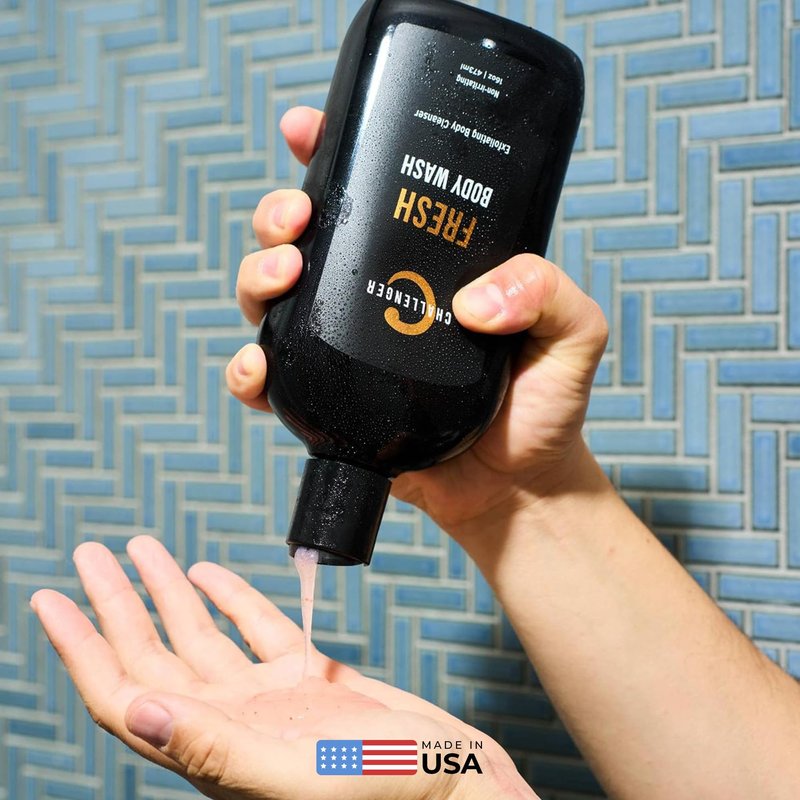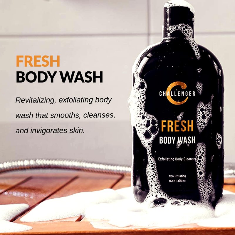 Challenger Men’s Fresh Body Wash, 16 Ounce | Exfoliating Cleanser with Aloe, Vitamin E, Tea Tree & Jojoba Oils | Moisturizing, Scrubbing Lather for Smooth, Strong Skin | Gentle Cleaning