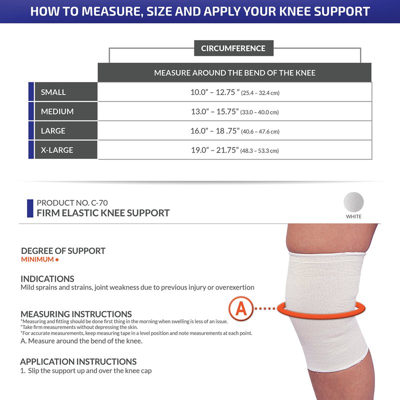 - Measure around the bend of the knee. Available Sizes: Small (10-12.75 Inches), Medium (13-15.75 Inches), Large (16-18.75 Inches), and X-Large (19-21.75 Inches).